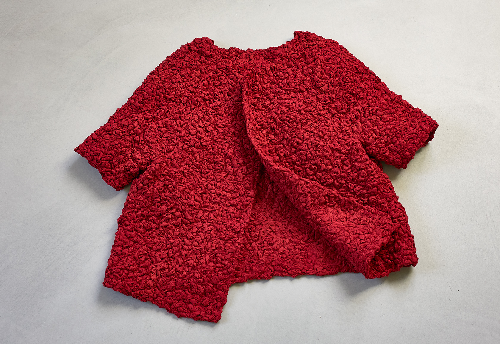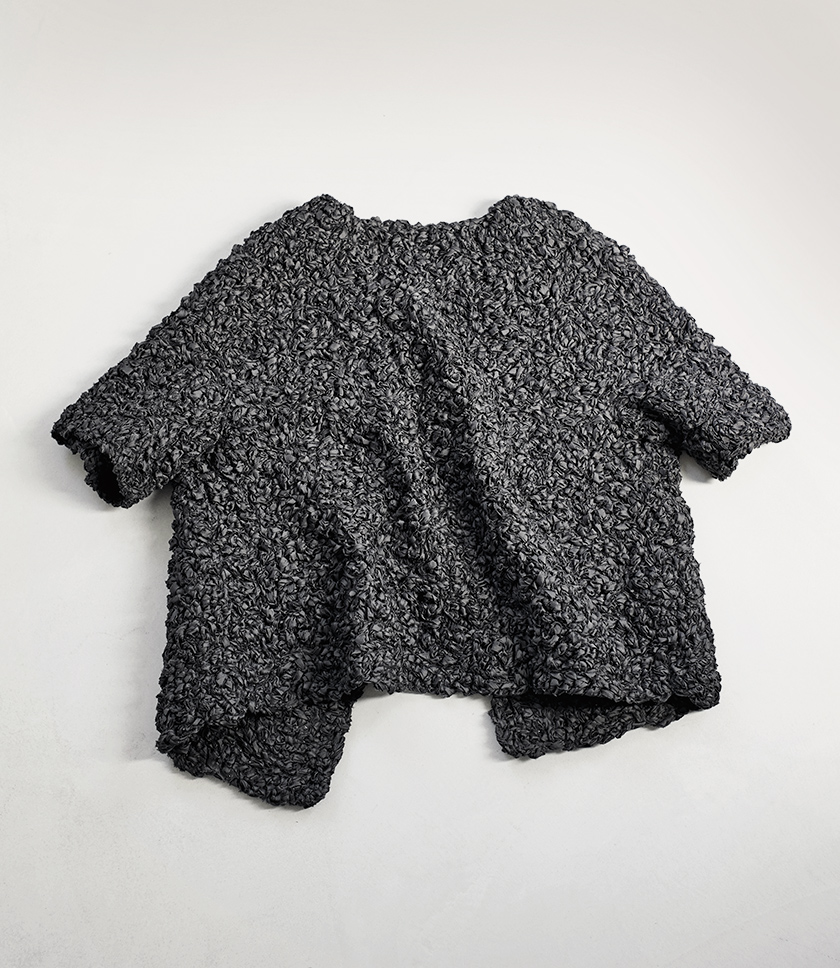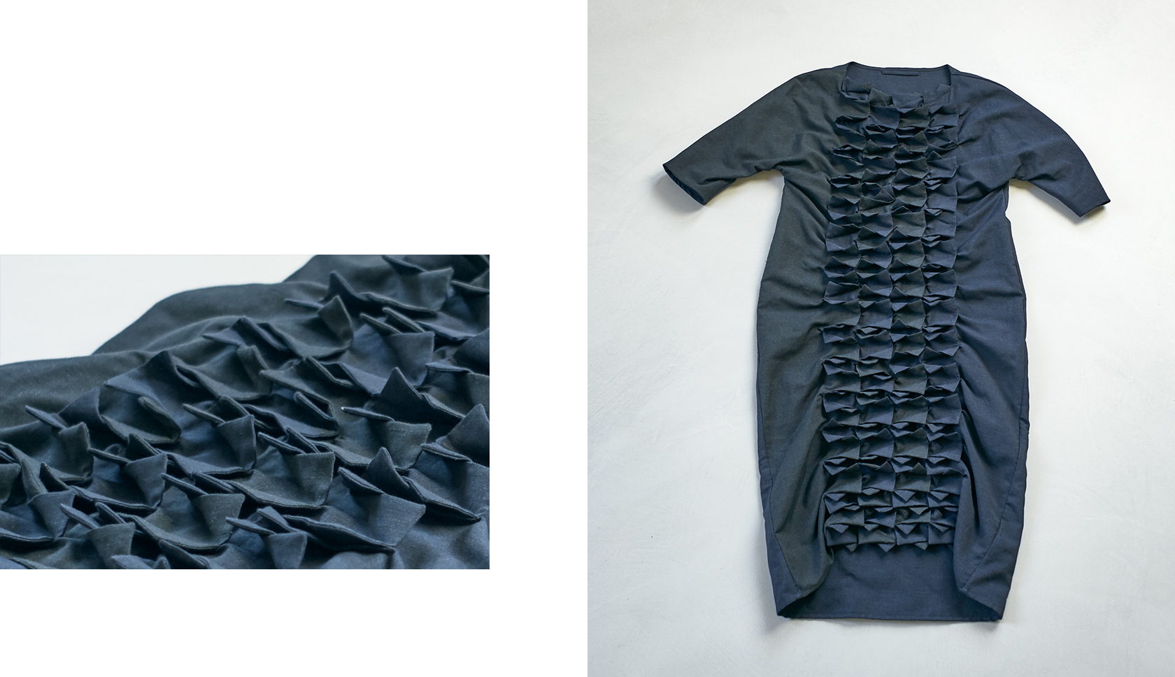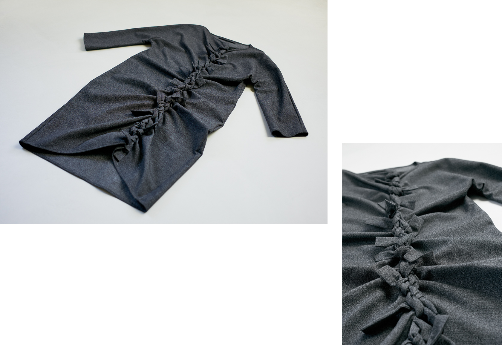 B O L L E: E’ un lavoro tutto artigianale e per certi versi empirico in cui l’equilibrio tra movimento che la lavorazione imprime al tessuto e forma dell’abito è estremamente delicato. Ogni capo-bolle ha perciò richiesto una lunga fase sperimentale.