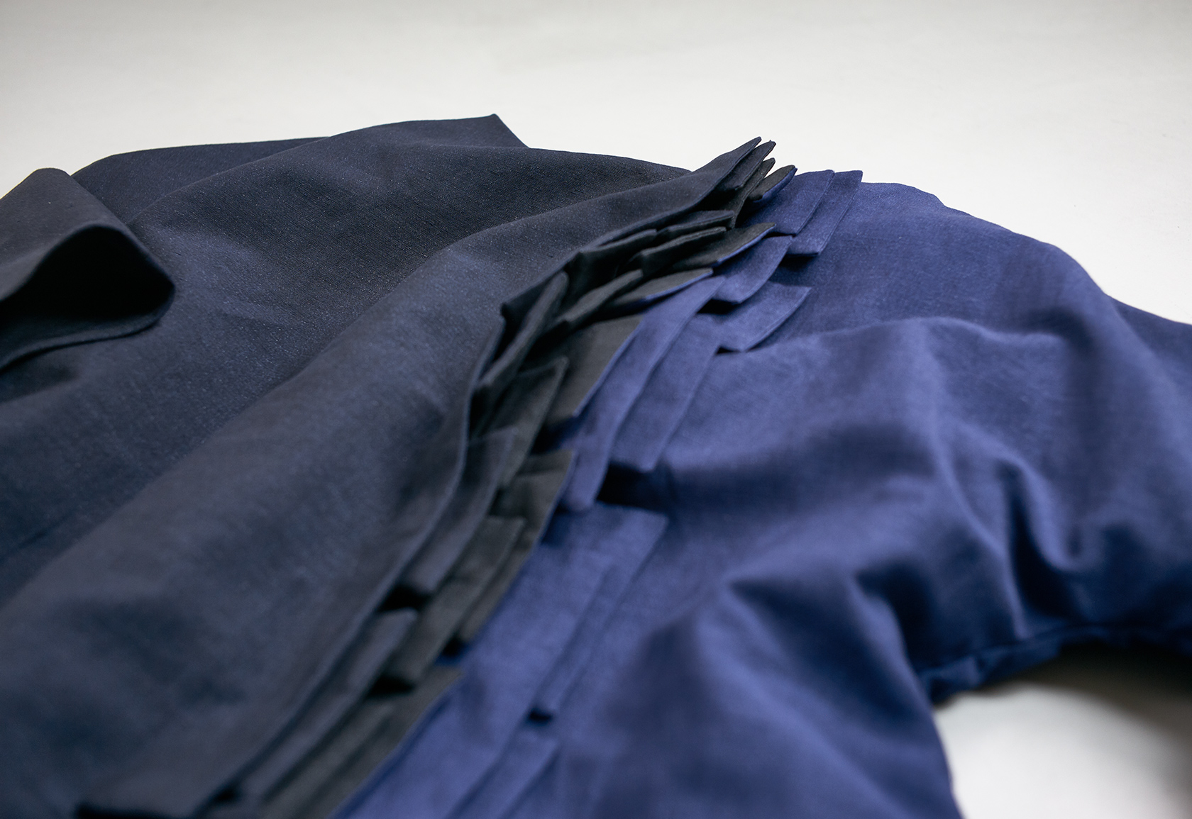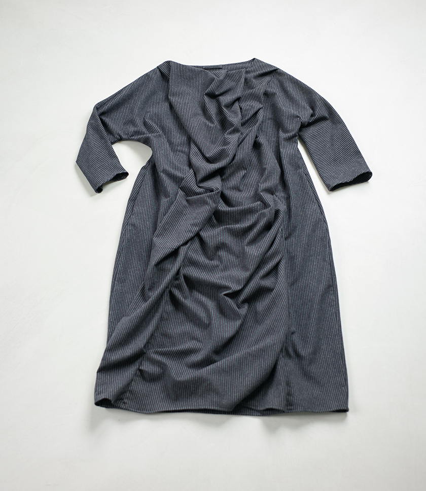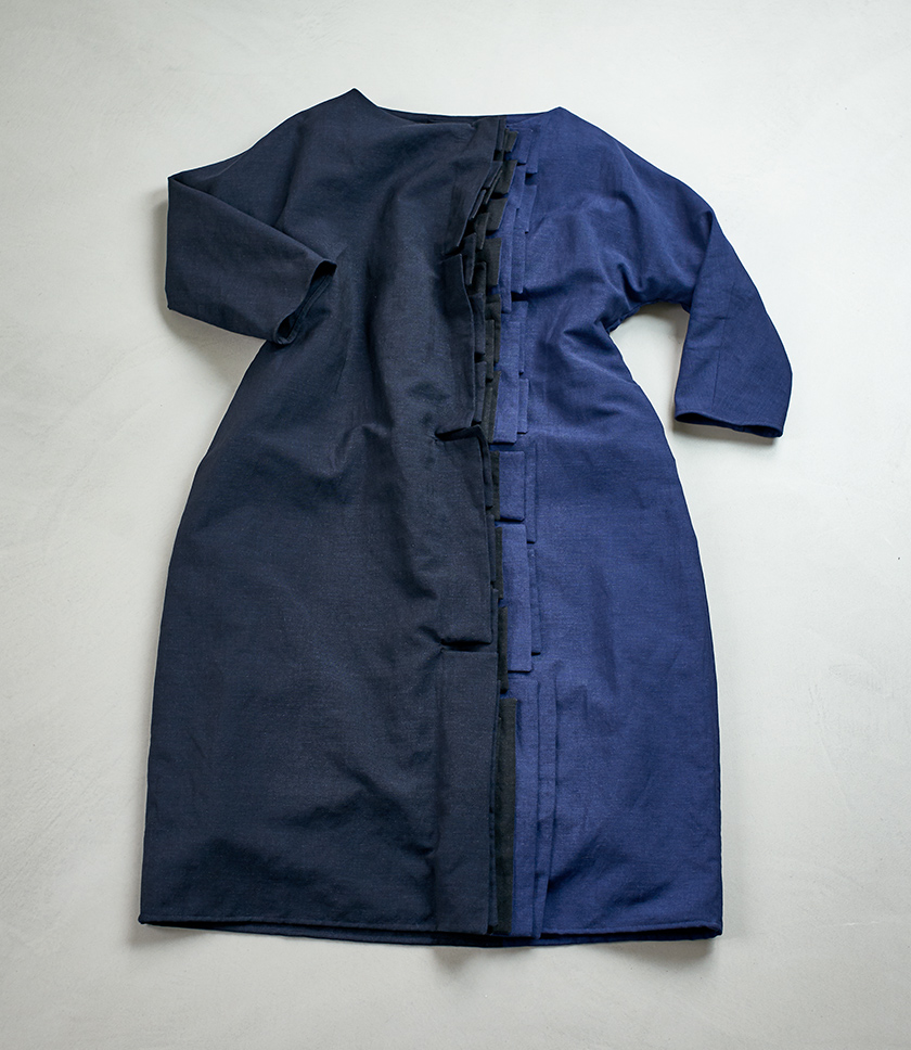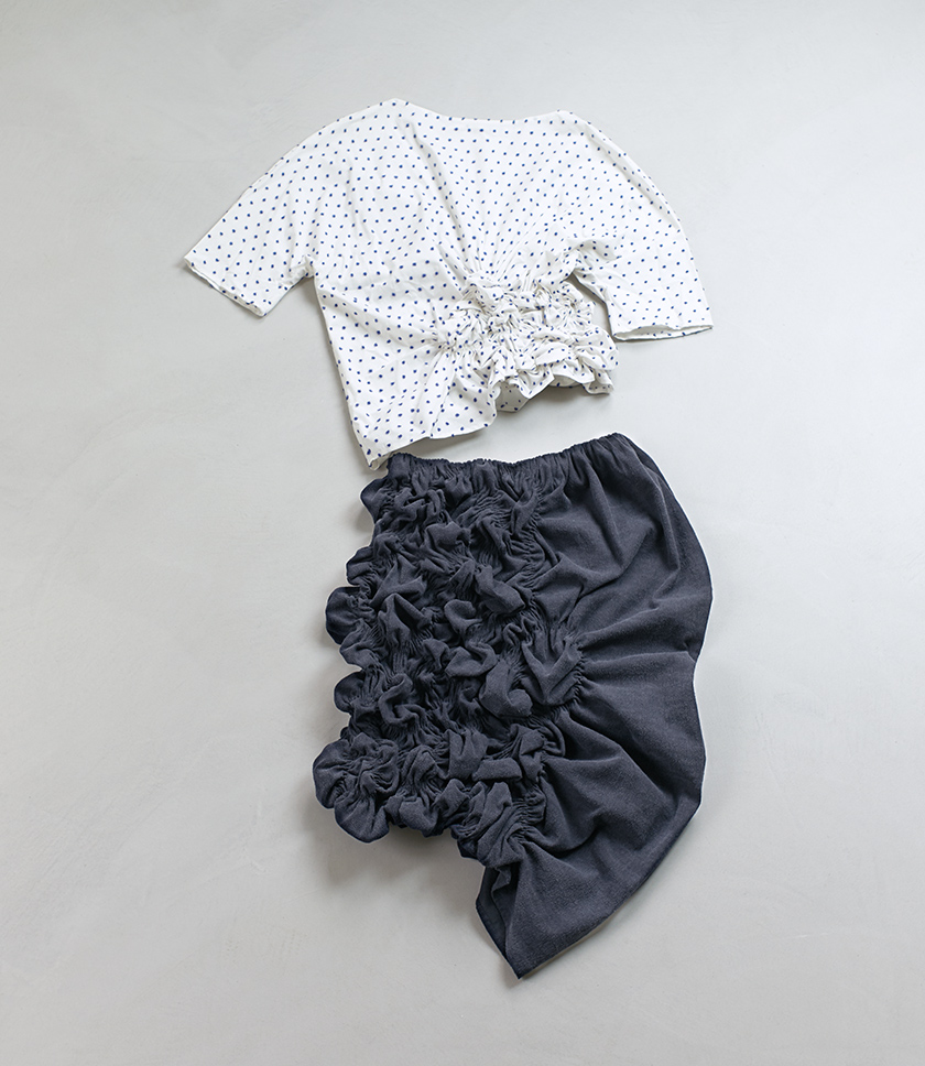 B O L L E: E’ un lavoro tutto artigianale e per certi versi empirico in cui l’equilibrio tra movimento che la lavorazione imprime al tessuto e forma dell’abito è estremamente delicato. Ogni capo-bolle ha perciò richiesto una lunga fase sperimentale.