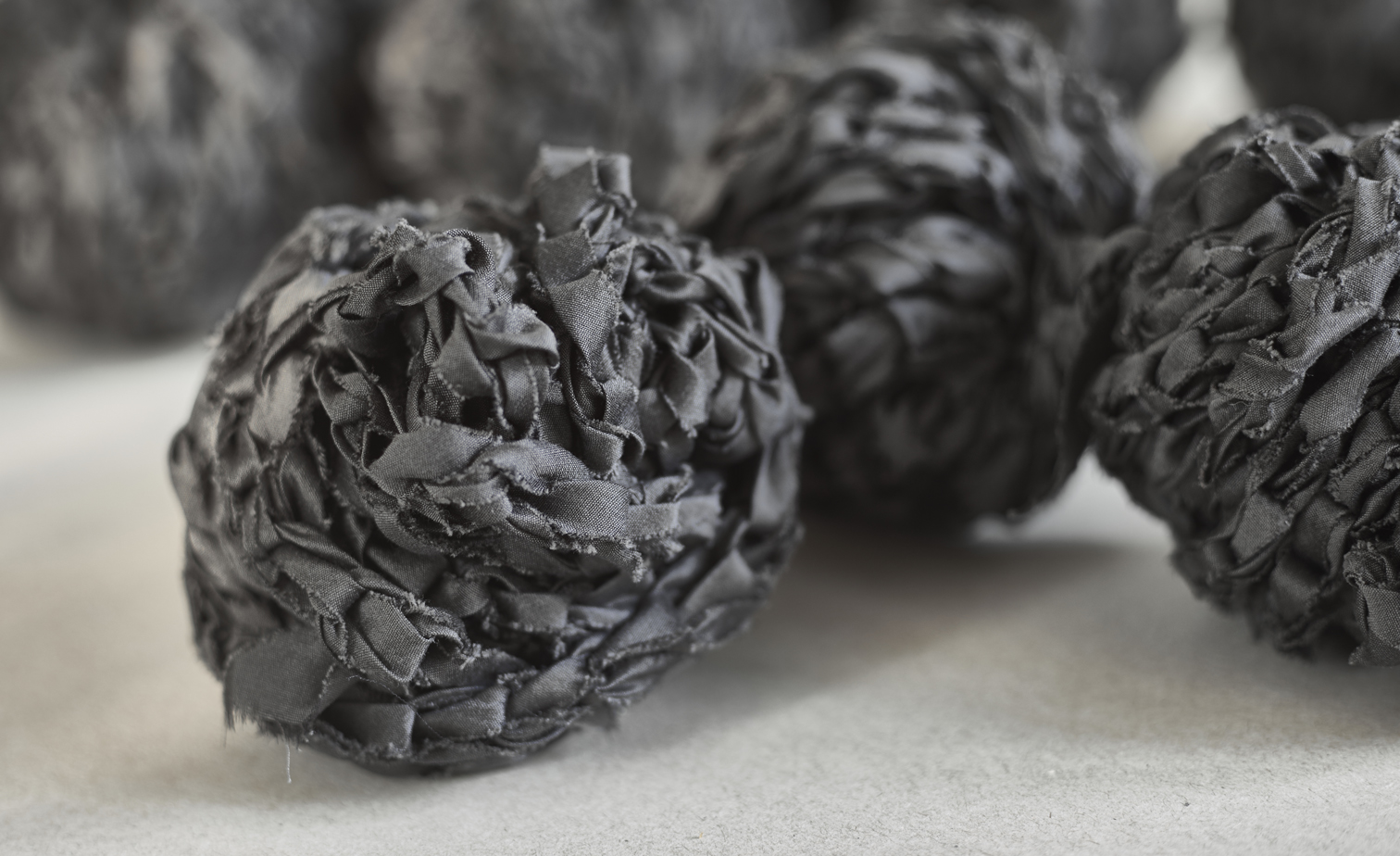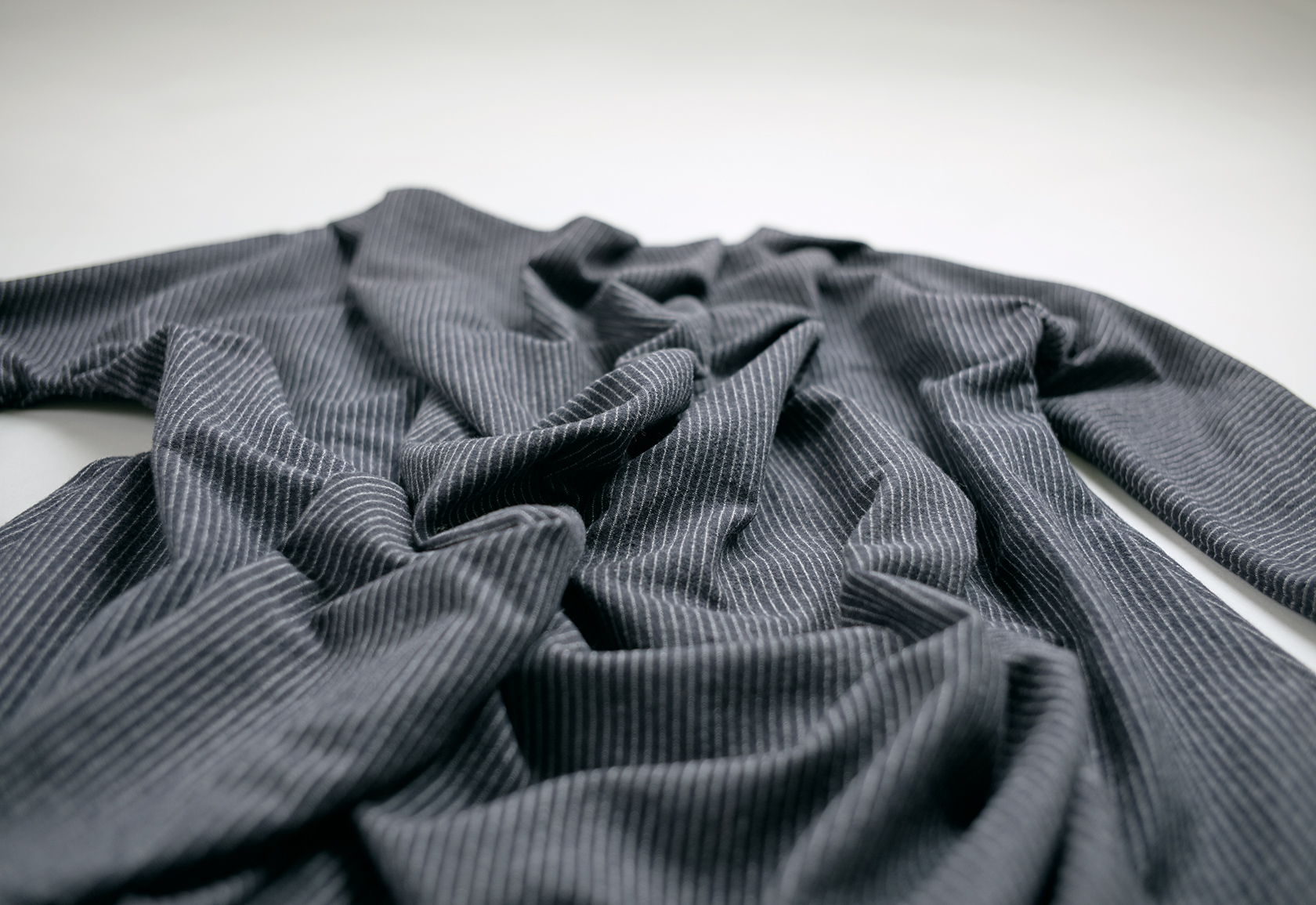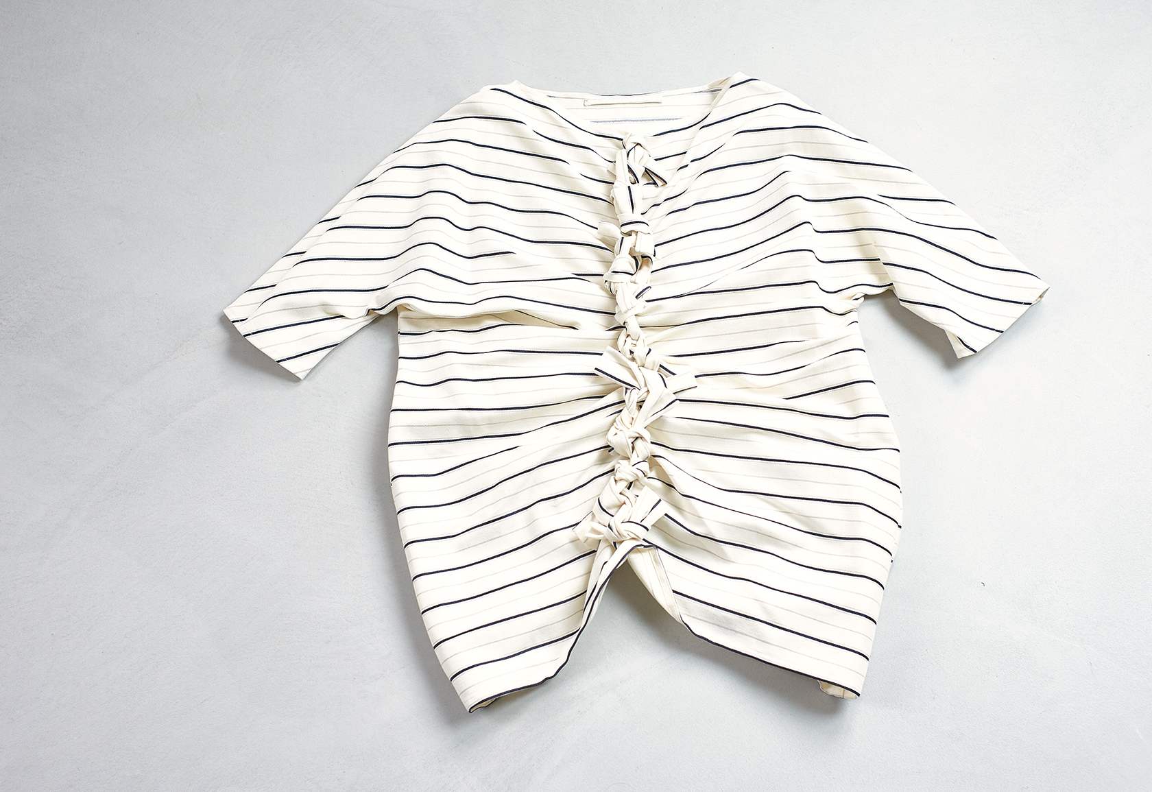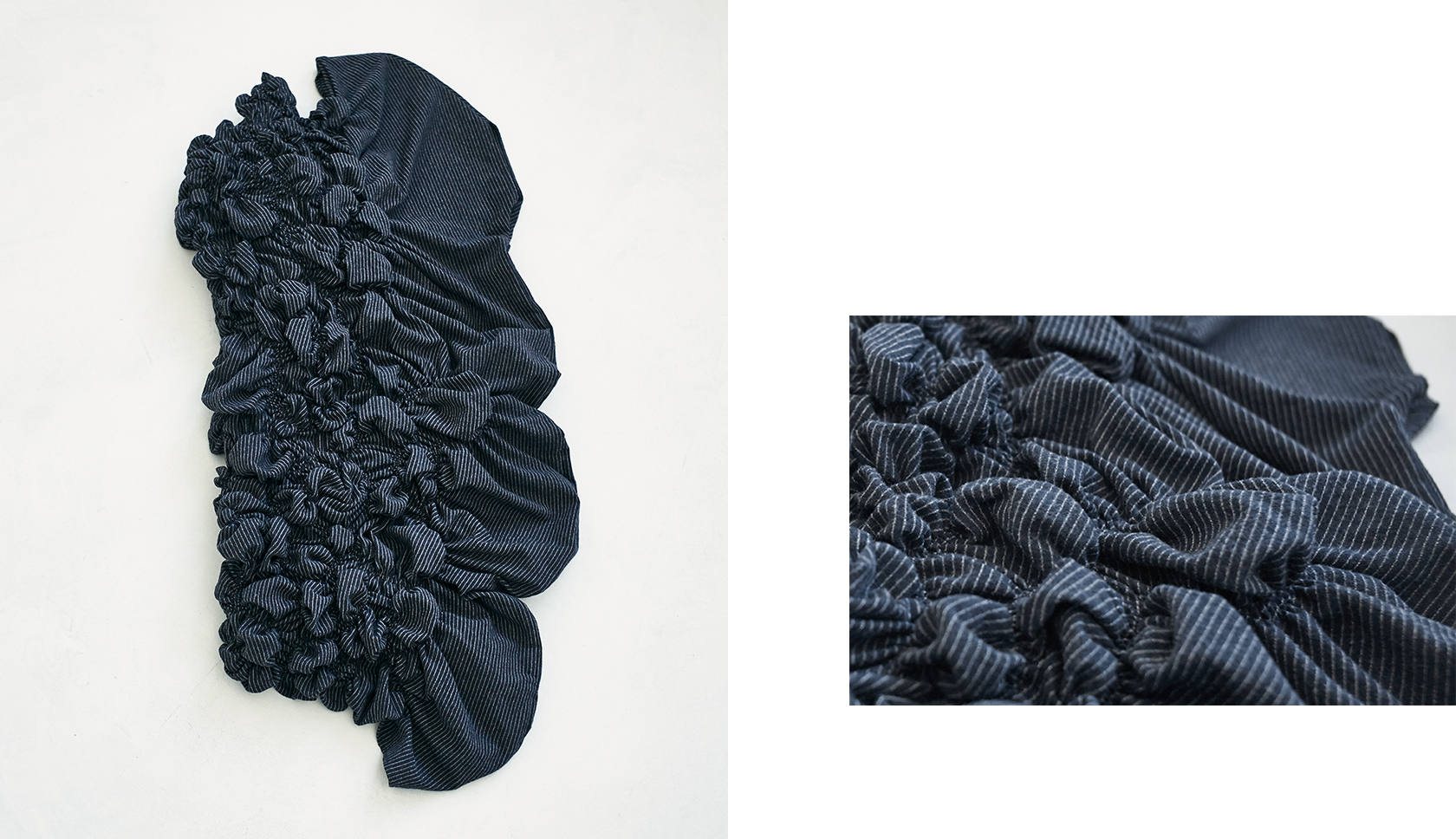 B O L L E: E’ un lavoro tutto artigianale e per certi versi empirico in cui l’equilibrio tra movimento che la lavorazione imprime al tessuto e forma dell’abito è estremamente delicato. Ogni capo-bolle ha perciò richiesto una lunga fase sperimentale.