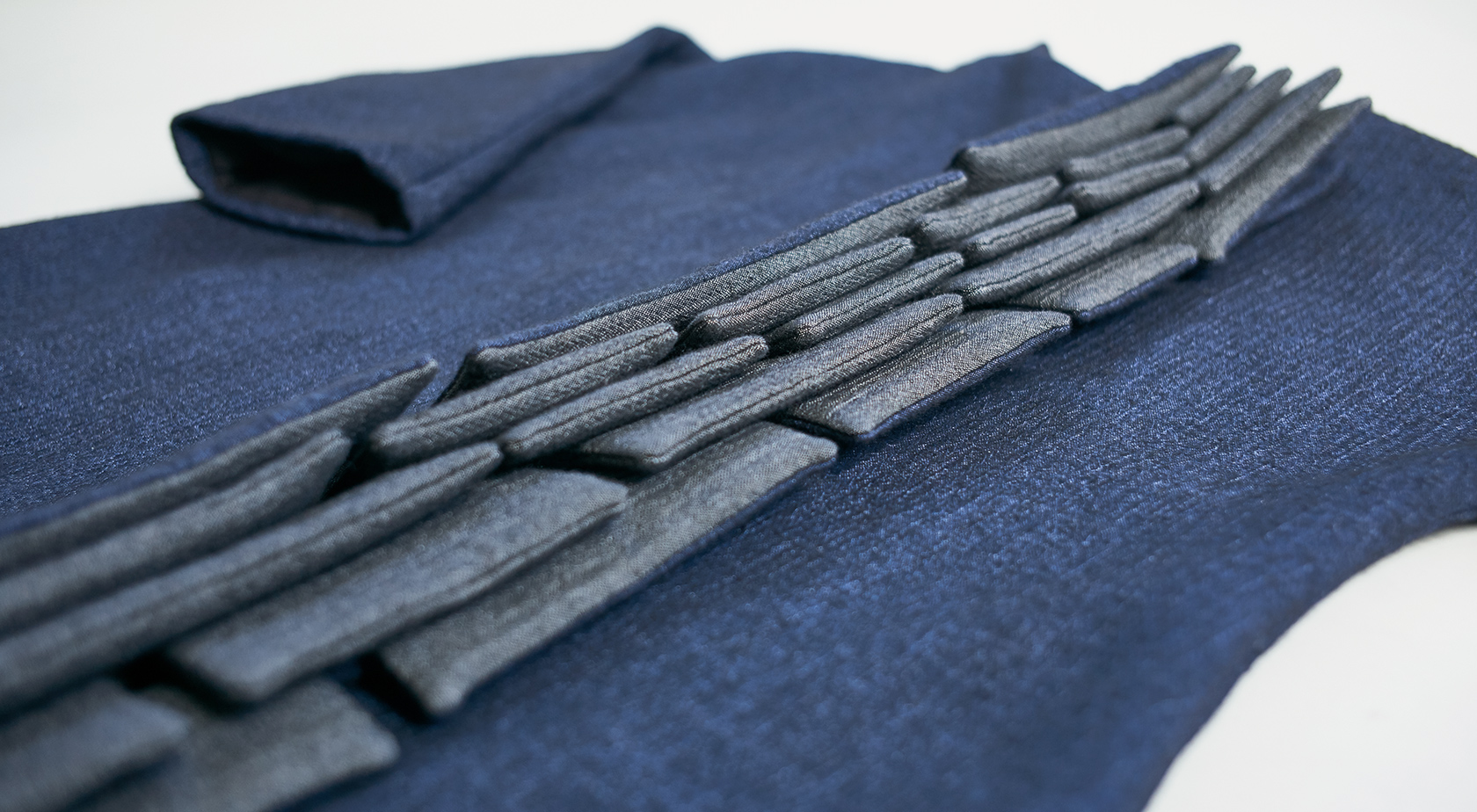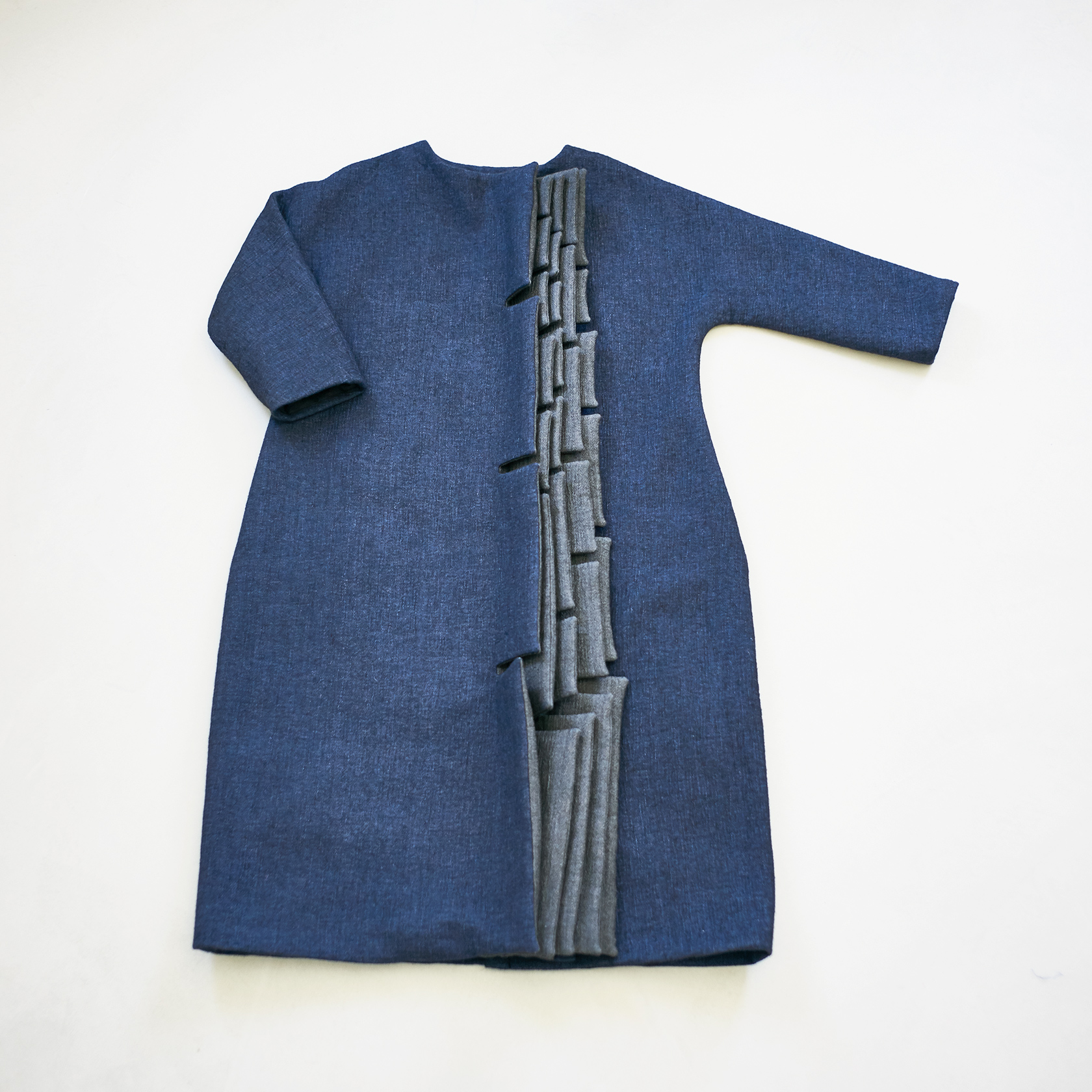 O R I G A M I: E’ un sistema modulare compatto in cui tutte le parti sono interconnesse. Tipologia del tessuto, effetto della lavorazione e modello dell’abito si sono composte in modo forte. Ma si tratta di una forza intrinseca contenuta in una forma semplice e al tempo stesso scultorea.